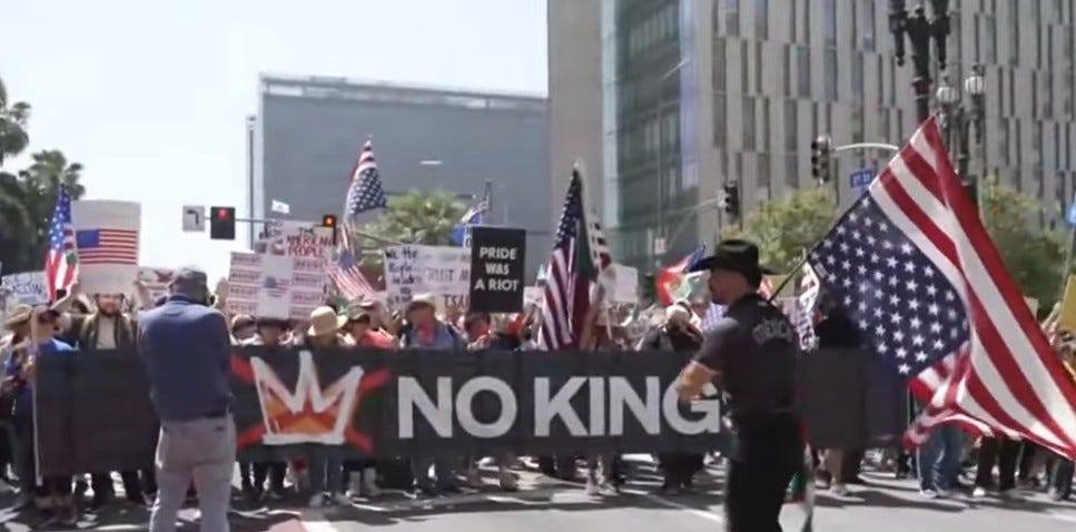 It’s raining in parts of the east coast, but people are still showing up and showing out. Here’s a few photos from around the world (one from Switzerland!) of the No Kings protests: