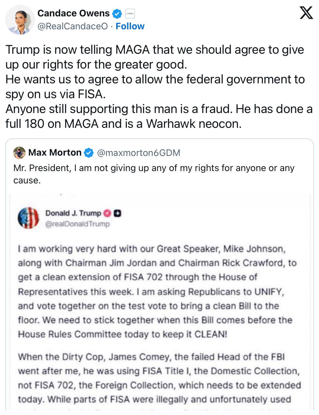 Candace Owens Calls Trump a Fraud Over FISA as 'Bitter, Intraparty Battle' Explodes