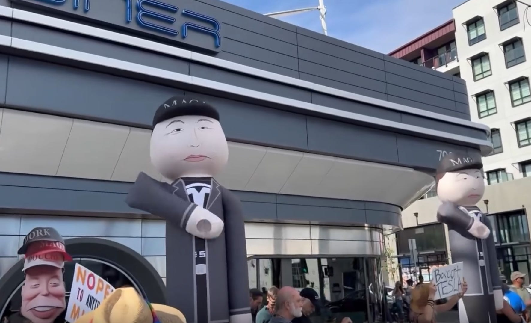 As Elon Musk tries to rebrand, protesters hit his Tesla diner with giant inflatables of Elon Musk doing his infamous 'Nazi' salute while Trump gets accused of cheating at golf. Again.