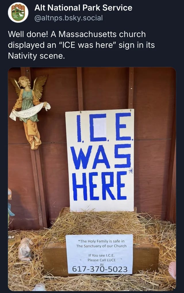 A church in Dedham, Massachusetts displayed an “ICE was here” sign where Mary, Joseph, and Baby Jesus should be in their Nativity scene, suggesting that Mary, Joseph and Baby Jesus were taken by ICE.