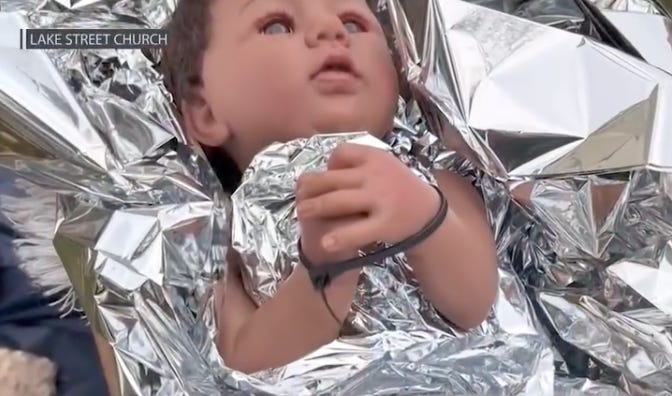 Baby Jesus is zip-tied, like ICE has done to children, and wrapped in an aluminum foil blanket.