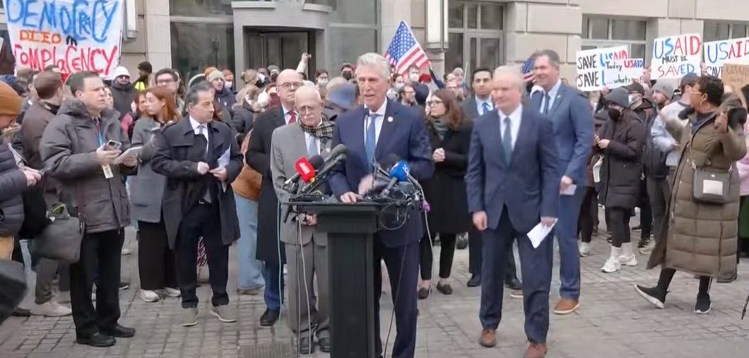 House and Senate Democrats held a protest and a press conference at the offices of USAID to speak out against Elon Musk’s illegal takeover of the agency.