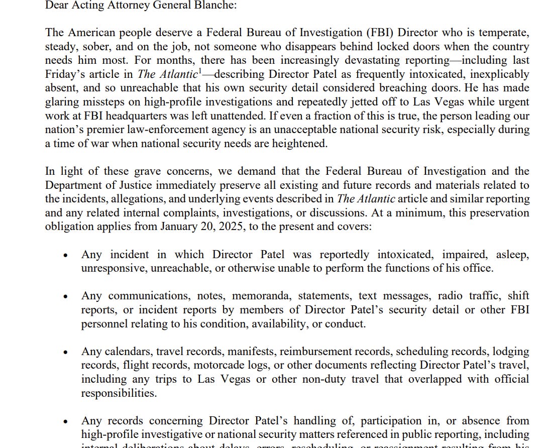 After a bombshell report that alleged FBI Director Kash Patel is engaging in erratic behavior and drinking heavily, Senate Democrats sent a loud signal that an investigation is coming.