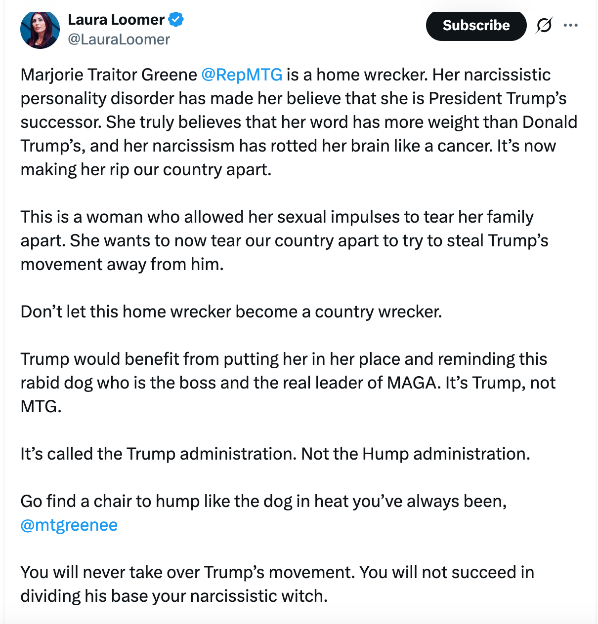 Laura Loomer attacked Marjorie Taylor Greene and then MTG bit back and meanwhile, Trump remains the godfather of manipulation. Eventually these two will destroy one another.
