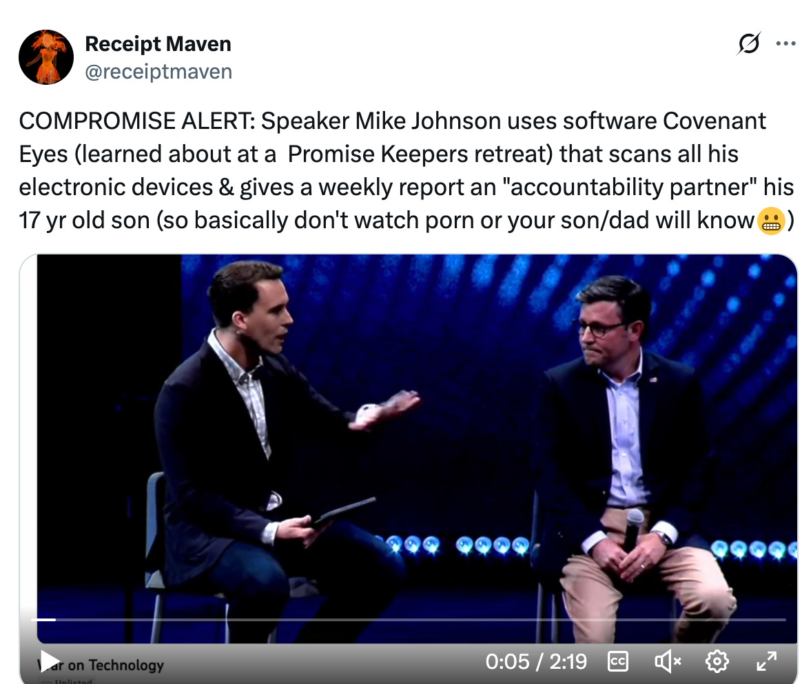 Speaker Mike Johnson feels threatened by naked bike riders protesting ICE in Portland. The man who needs an app to monitor his porn addiction is threatened by naked bike riders.