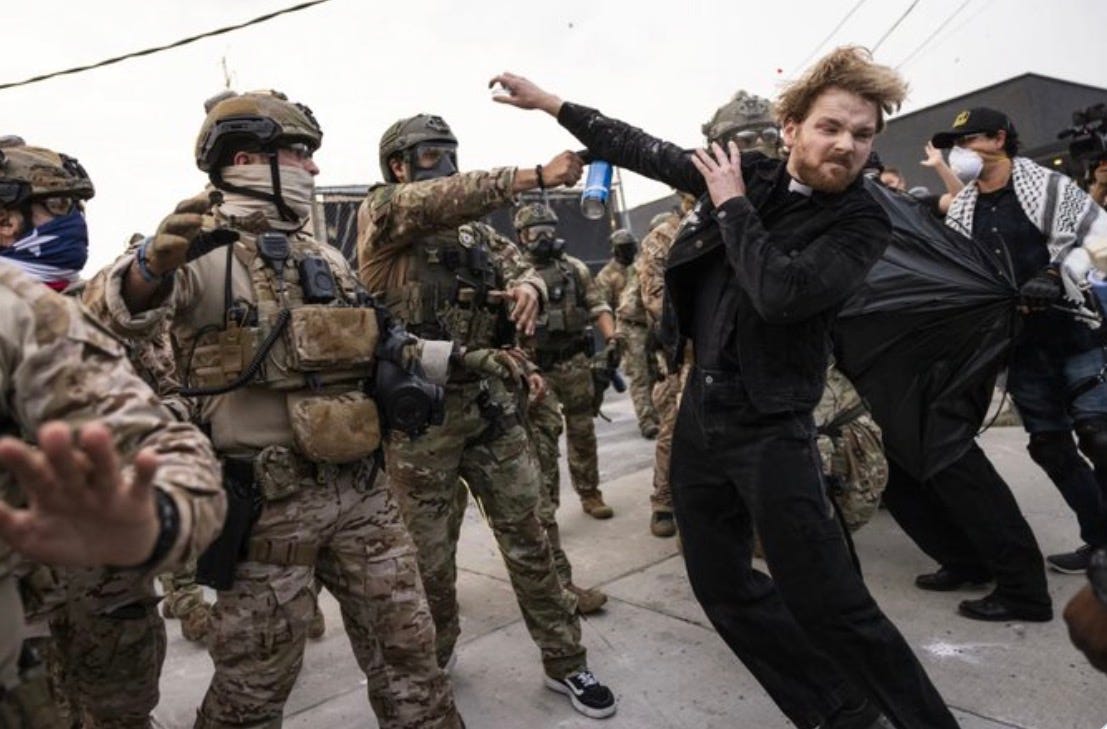 The Rev. David Black “looked up at a group of masked, heavily armed ICE agents on the roof and began to pray,” the National Catholic Reporter wrote. Black invited the agents to repentance, to receive salvation. They responded by pepper spraying him in his head, causing him to drop to his knees in pain. They continued to fire.