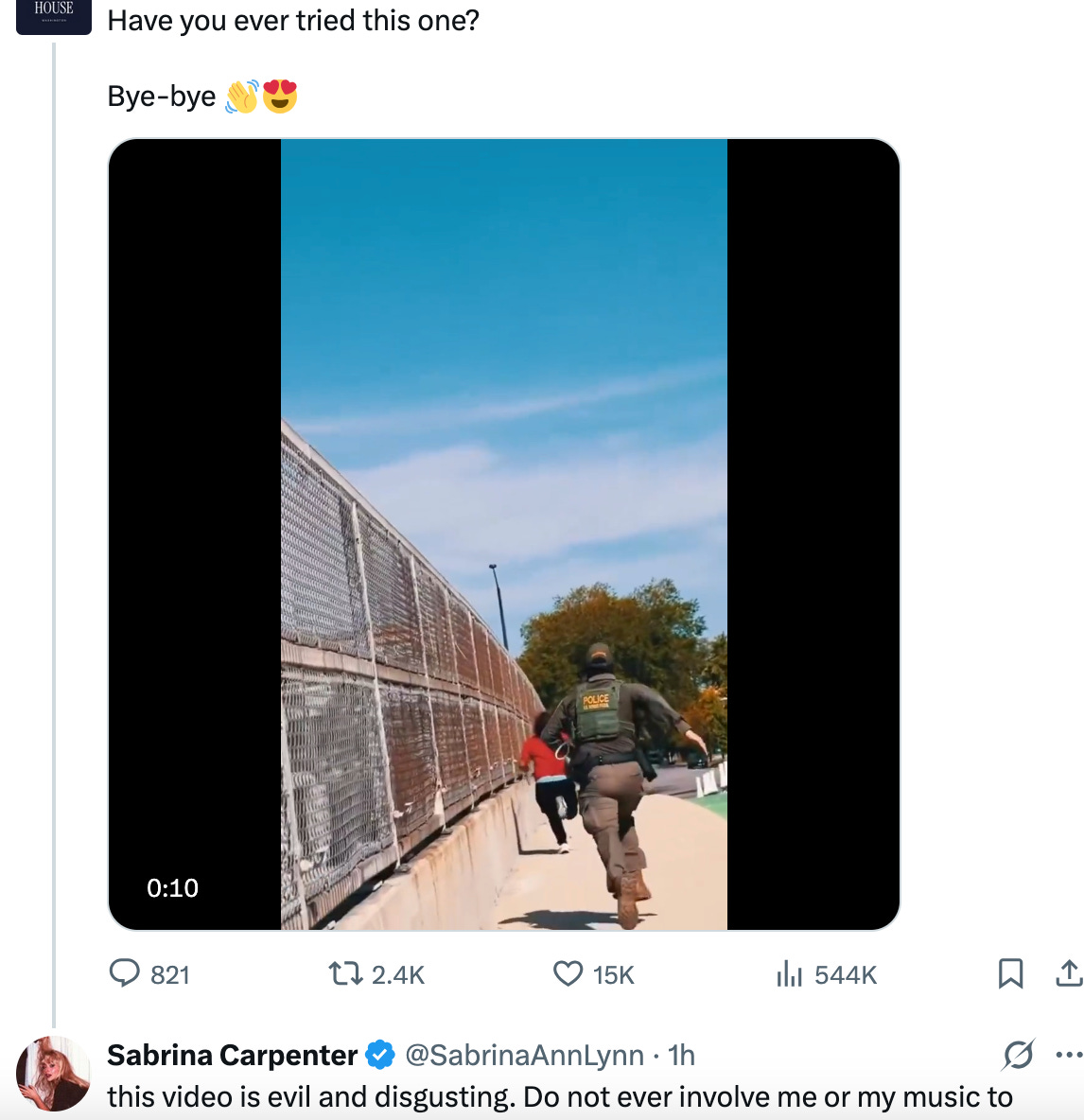 Sabrina Carpenter blasted the White House for using her song in an ICE propaganda video: “this video is evil and disgusting. Do not ever involve me or my music to benefit your inhumane agenda.”