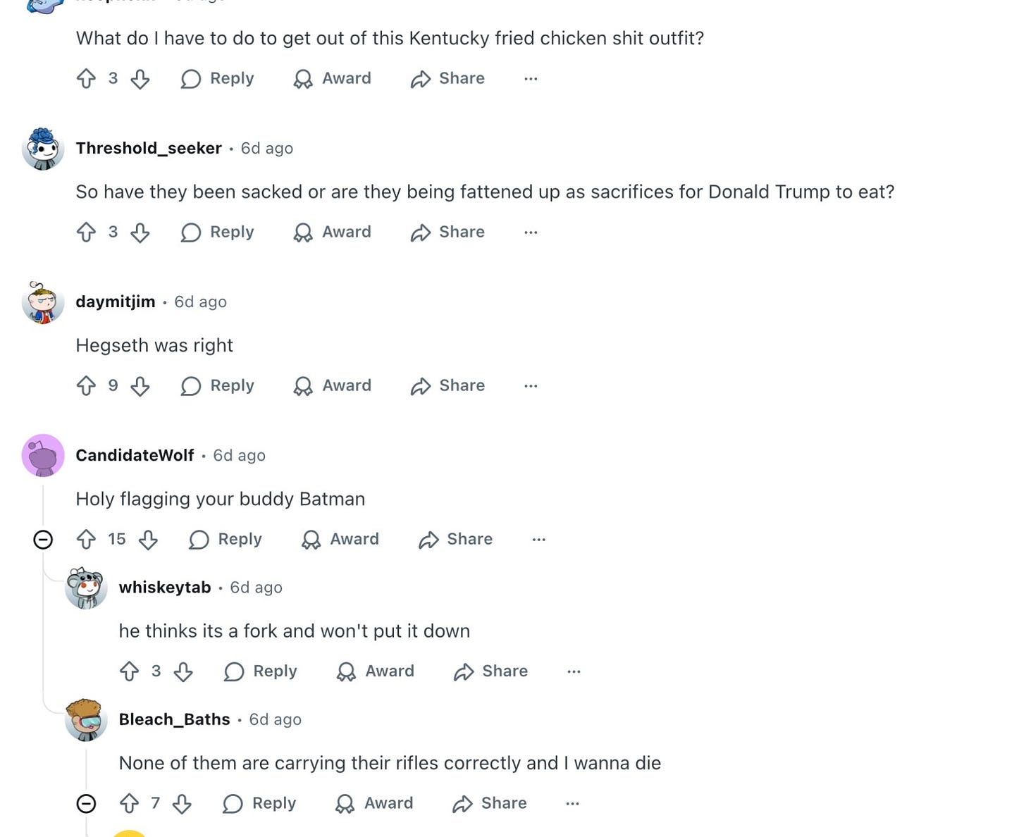 "For your own safety, DO NOT get between these guys and a deep dish pizza," one commenter wrote after a very unflattering photo of incoming troops was posted.