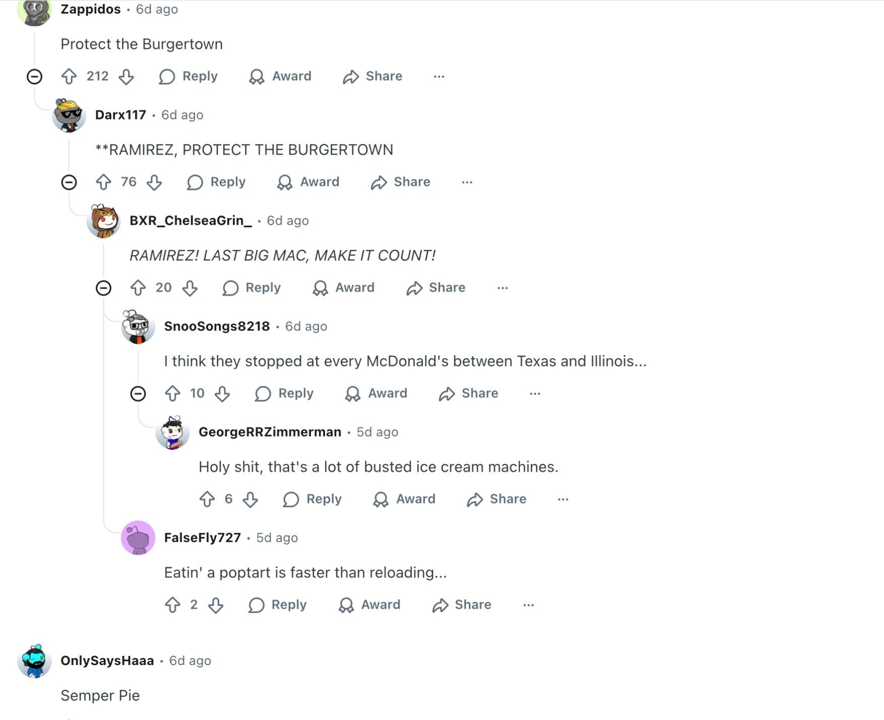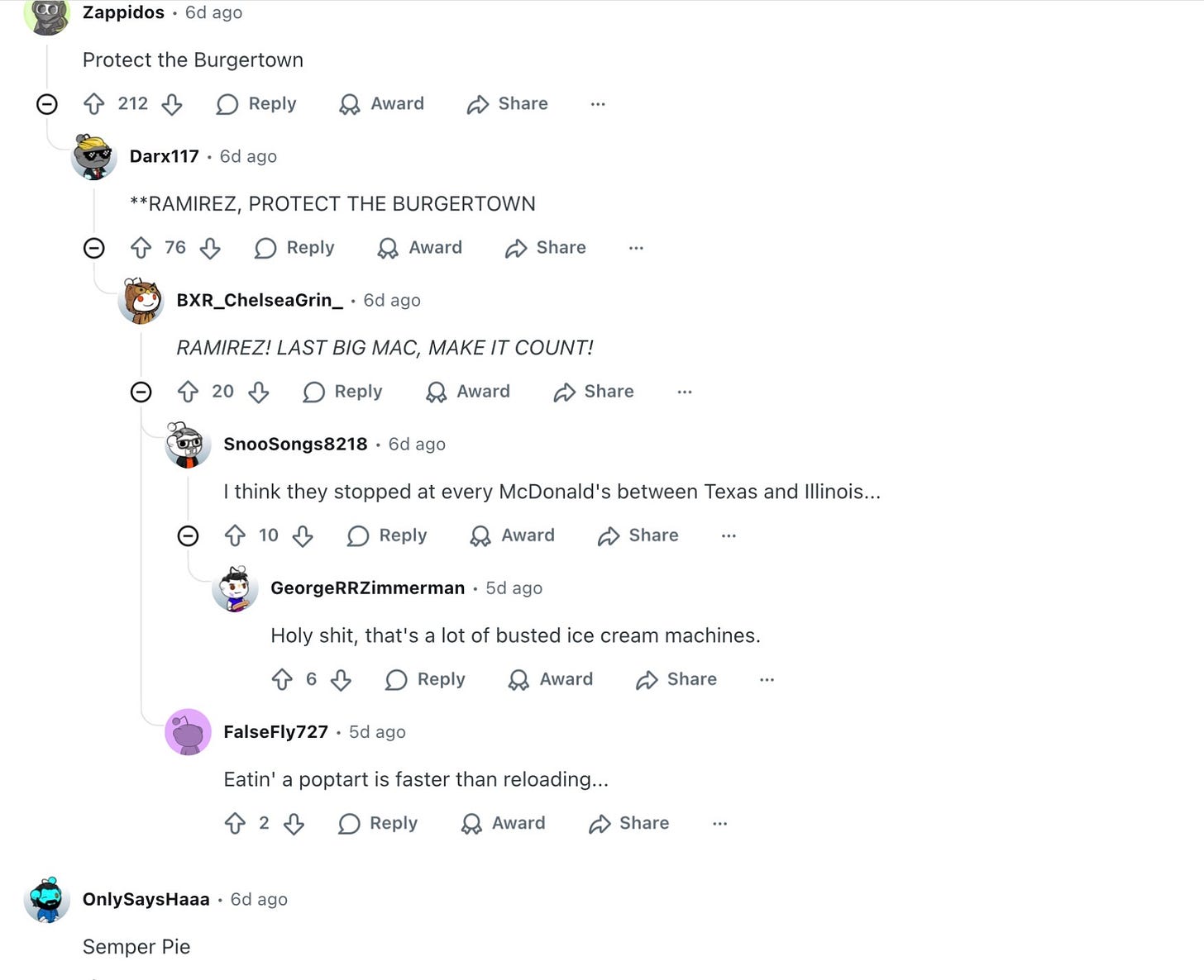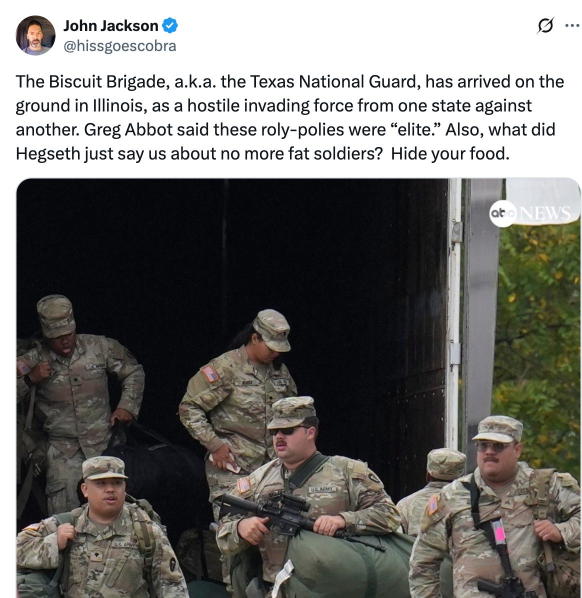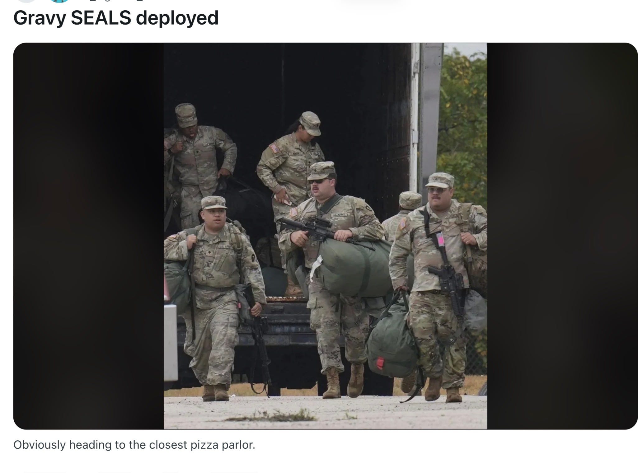 “For your own safety, DO NOT get between these guys and a deep dish pizza,” one commenter wrote after a very unflattering photo of incoming Texas National Guard troops to Illinois was posted by ABC News.