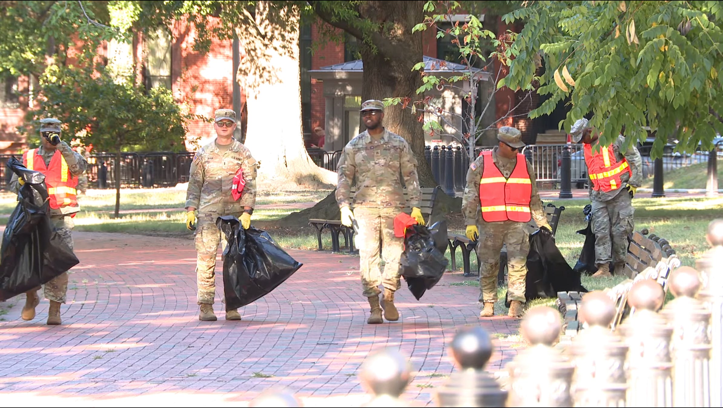 A busload of National Guard members were seen picking up trash around Lafayette Park, just outside of the White House on Tuesday: