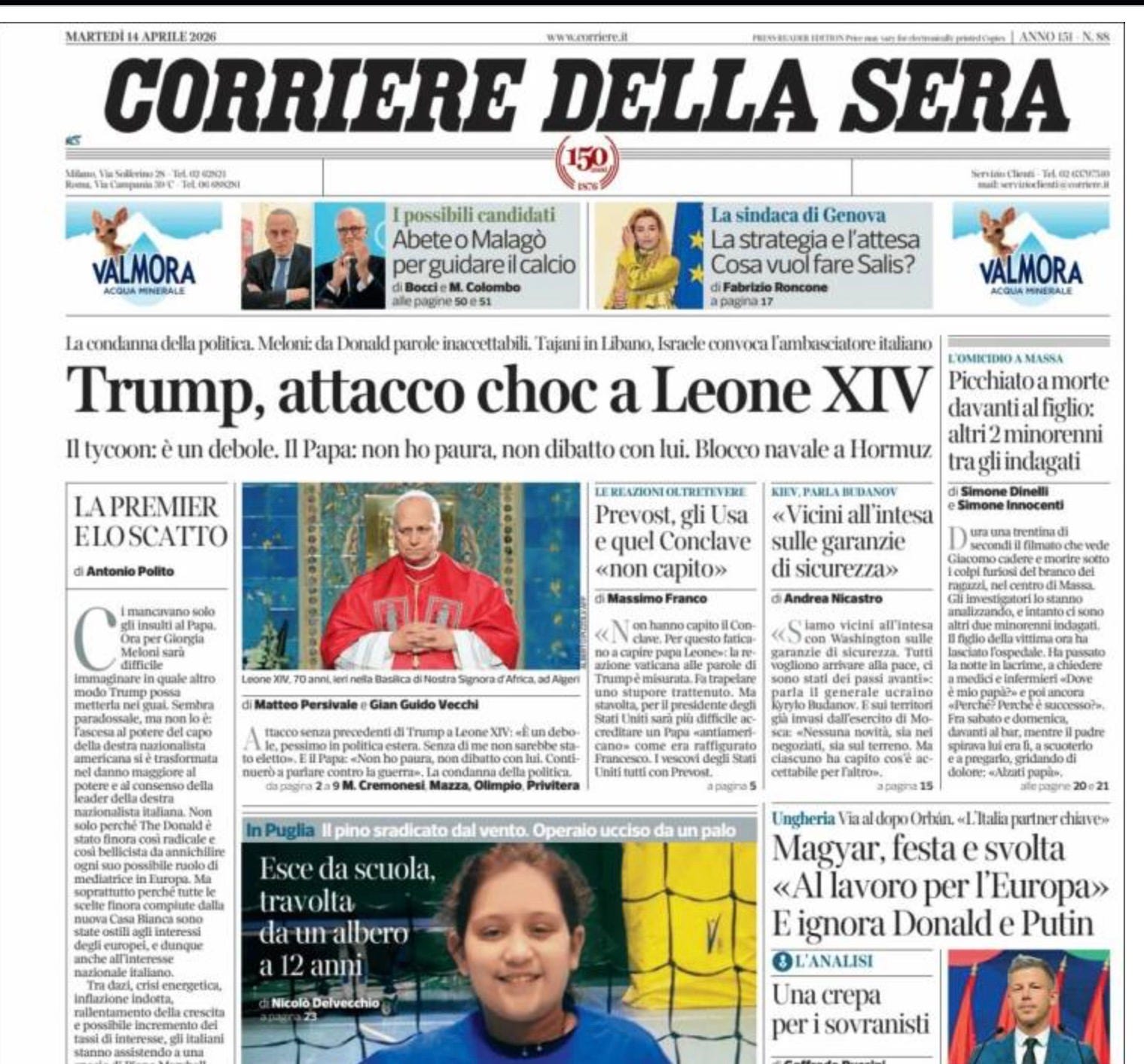 And then we have the Milan base Corriere della Sera also talking about Trump's shocking attack on Pope Leo the 14th, and the condemnation from politicians with Miss Meloni, saying that Trump's words and statements are unacceptable.