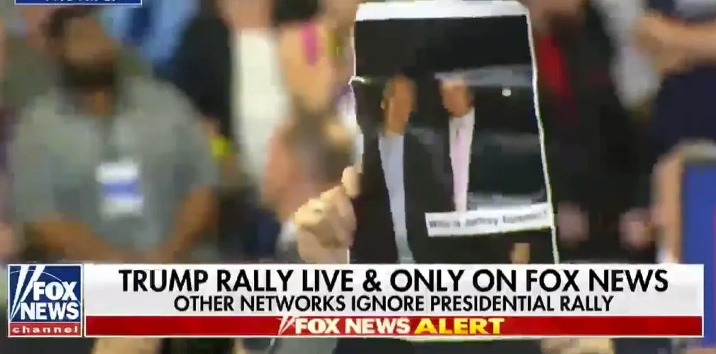 Below is a screen grab of a protester showing a photo of Donald Trump with Jeffrey Epstein during a 2018 Trump rally in Duluth, Minnesota, leading to Trump sneering at the protester, “Go home to your mom, darling” as he has security throw the man out. The crowd, that supposedly cares about the Epstein Files, boos the man who was trying to warn them.