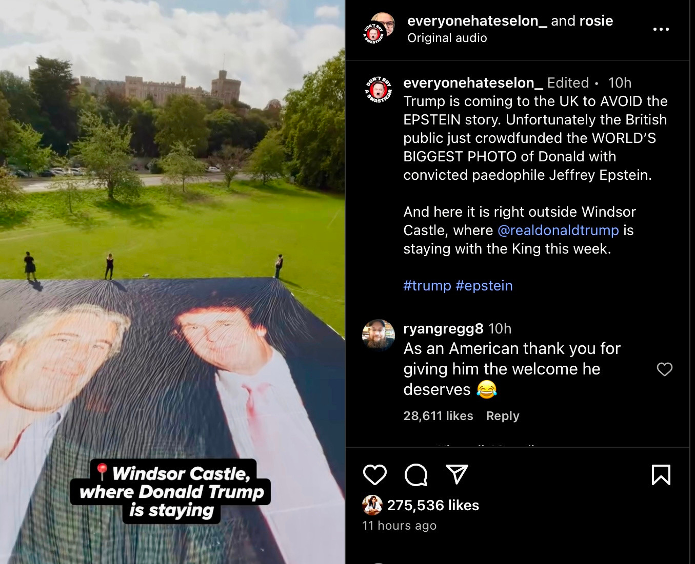 "We just unveiled the world’s largest copy of the infamous Trump Epstein photo right where Trump is about to stay with King Charles," activist 'Everyone Hates Elon' shared on a crowdfunding site.