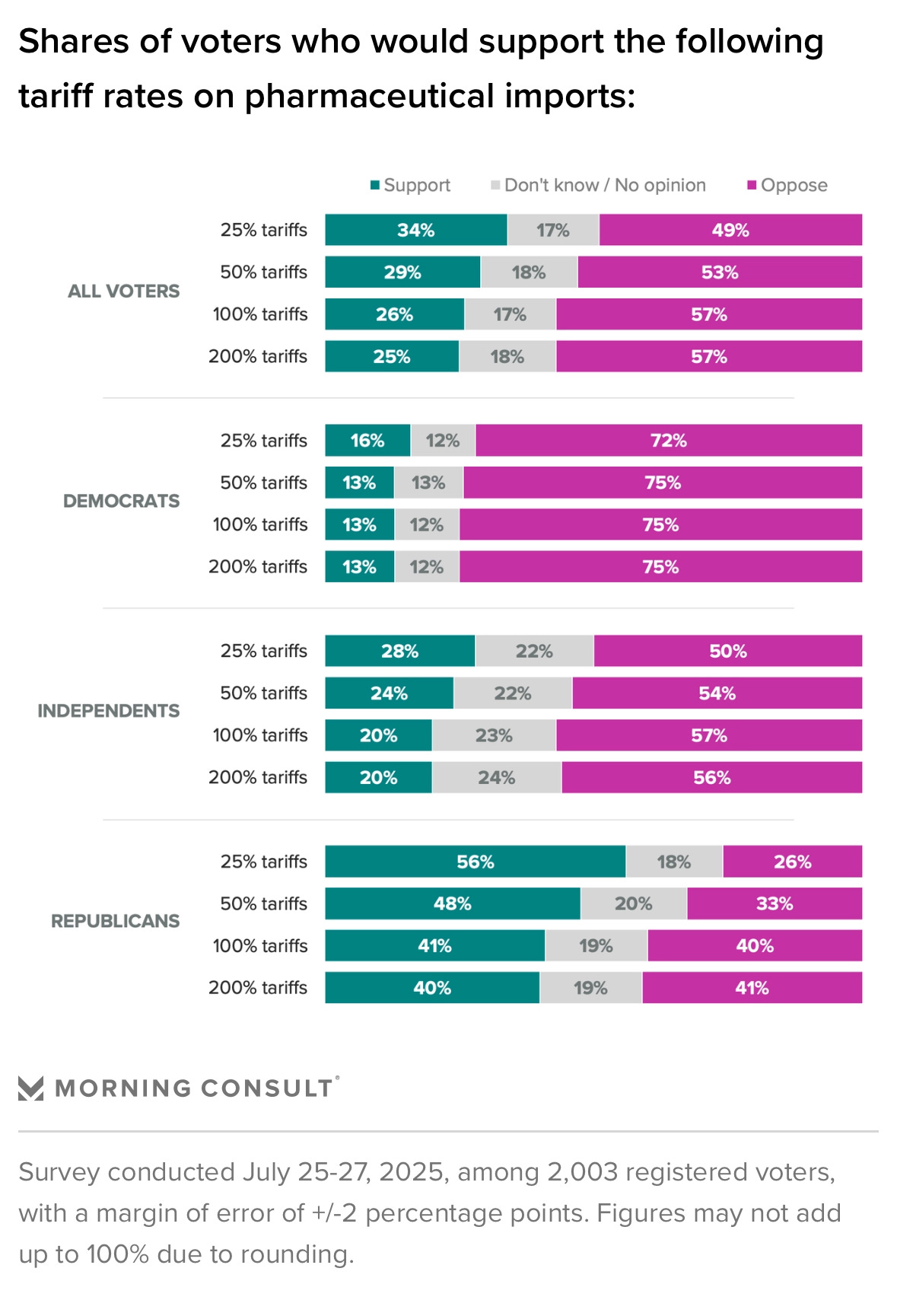 Americans by a clear majority do not support President Donald Trump’s floated 100-200% tariffs on prescription drugs, and nearly half would oppose a 25% tariff on prescription drugs, according to new research by Morning Consult.