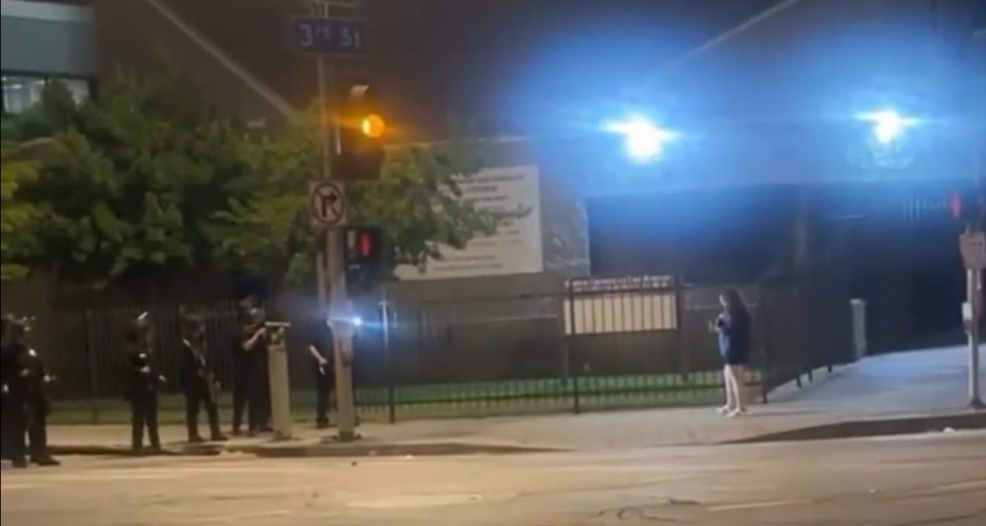 In video captured by labyrinthlore, we see her witness a woman who was walking alone and appears to be unarmed being shot by authorities on 3rd street after being shouted at by a line of officers to leave the area.