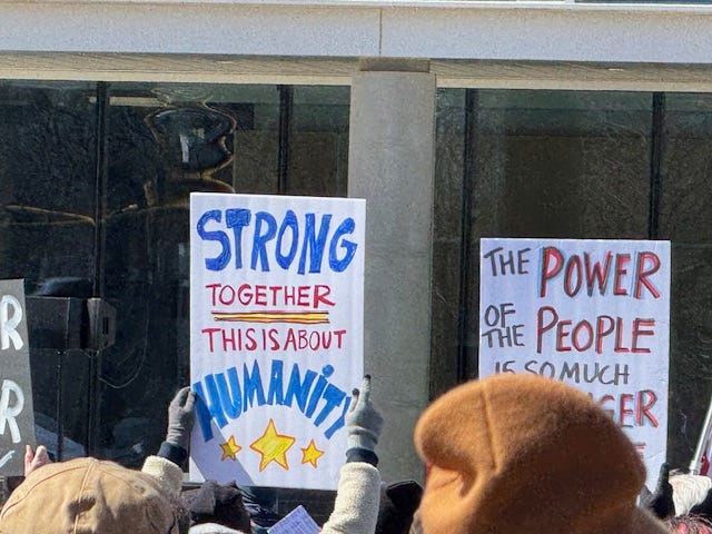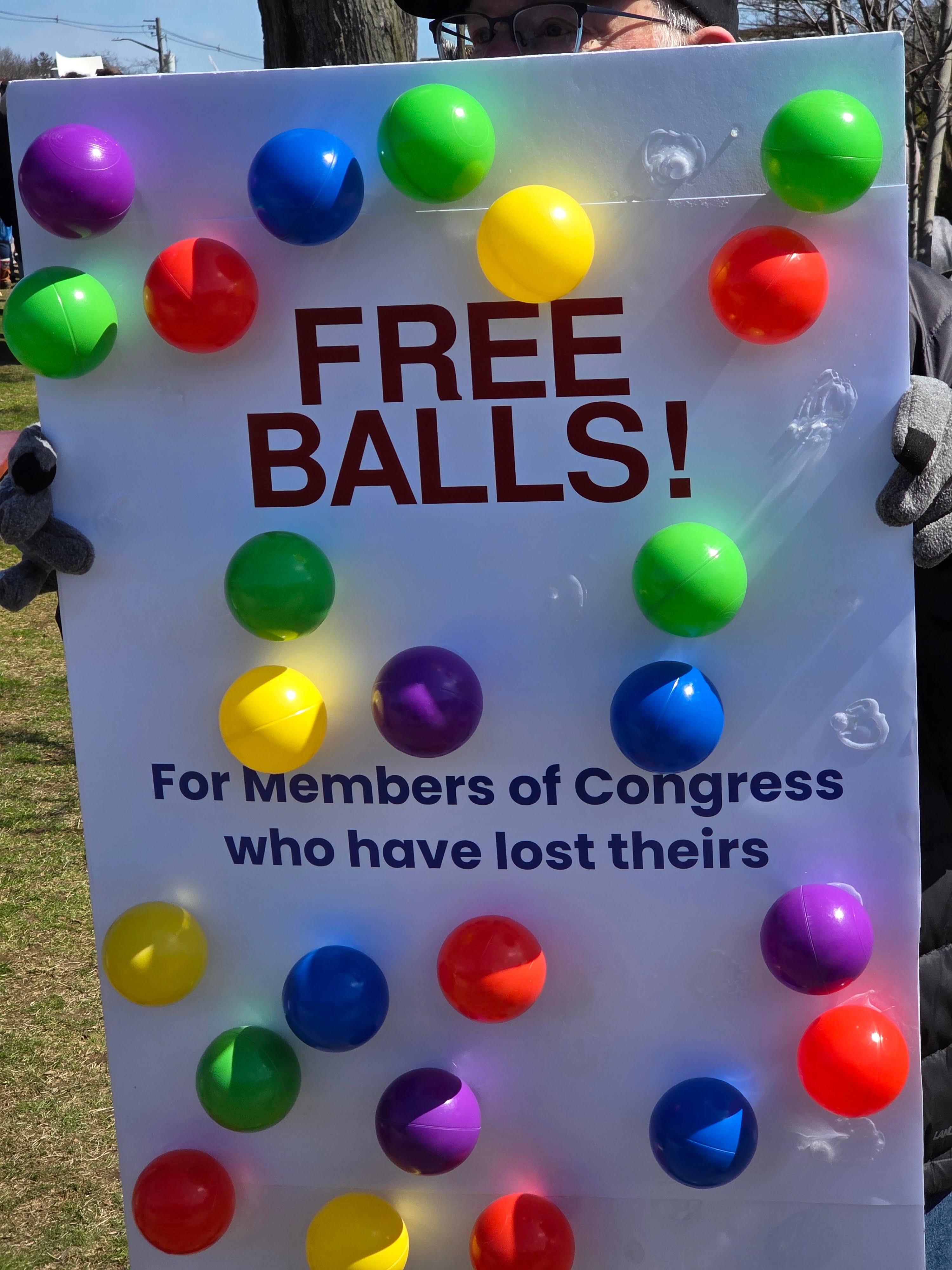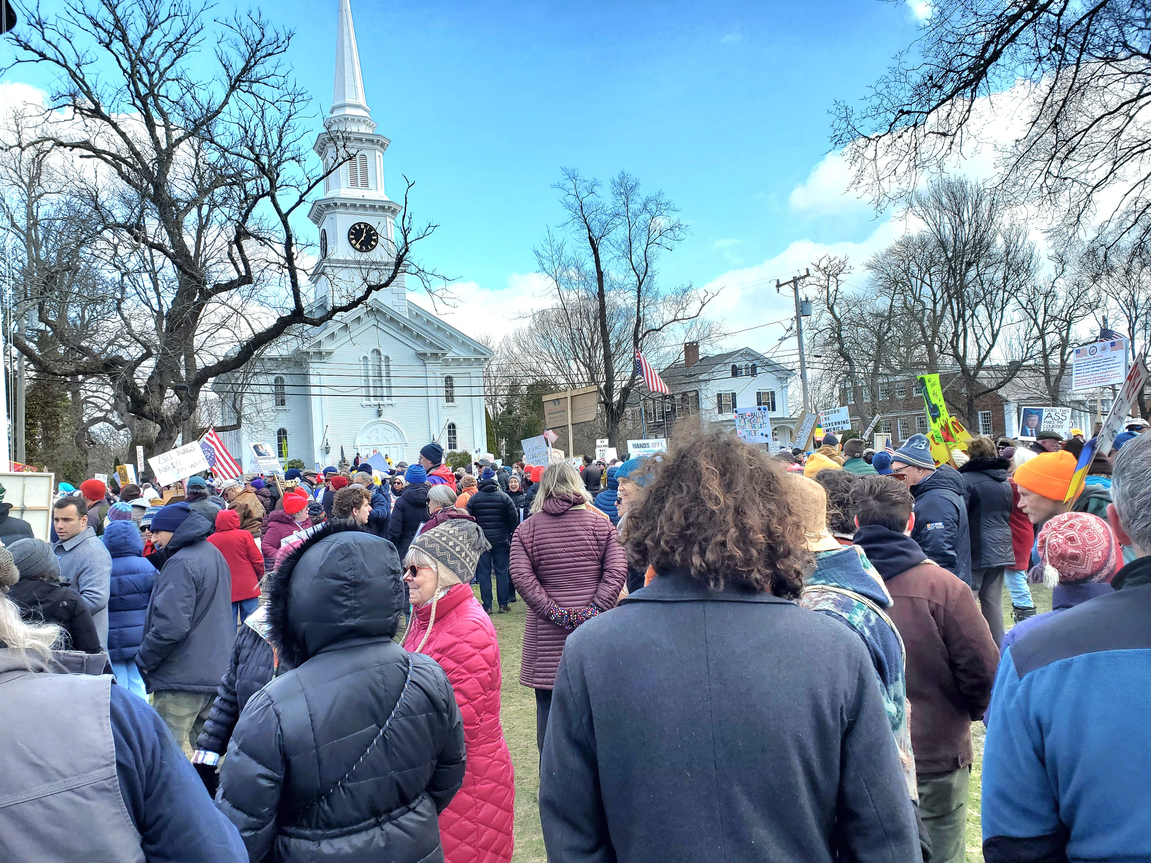 A report from Falmouth, MA, “We estimated about 2,000 people on our Village Green in Falmouth, MA, yesterday. There were folks dressed in shark suits, turtle suits, tri-corner hats, and sporting clever signs. There were also a lot of dogs suitably signed on their little backs. One woman was passing out cookies in the shape of a crown. Our local Indivisible even had enough $ to fund a police detail and rent a few port-a-potties. There were speeches and singing, with the lyrics available via a QR code. The crowd was positive, but righteously pissed off, and it was a great day.”